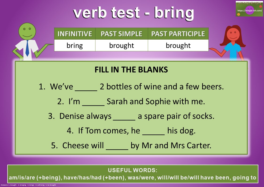 bought OR brought? | Vocabulary | EnglishClub brought And brought is the past tense and past participle of the verb bring —meaning to take or go with something or someone to a place. We use brought with the past simple tense and with present perfect and past perfect tenses. Here are some example sentences: I didn't bring the dog but I brought my children with me. (Past Tense) Conjugation bring | Conjugate verb bring | Reverso ... Conjugate the English verb bring: indicative, past tense, participle, present perfect, gerund, conjugation models and irregular verbs. Translate bring in context, with examples of use and definition.